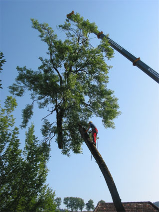 Die abgesägte Krone wird sicher weggehoben